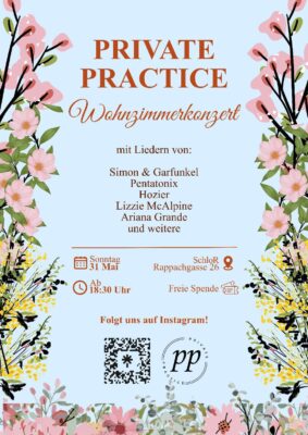 Wohnzimmerkonzert | Chor Private Practice When 31.05.2026 18:30 - 21:30 Add To Calendar Download ICS Google Calendar iCalendar Office 365 Outlook Live Event Type Freie Spende Konzert Wohnzimmerkonzert vom Chor Private Practice 31. Mai um 18:30 Bitte Sitzplatz reservieren unter: https://www.eventbrite.com/e/wohnzimmerkonzert-tickets-1987806170767